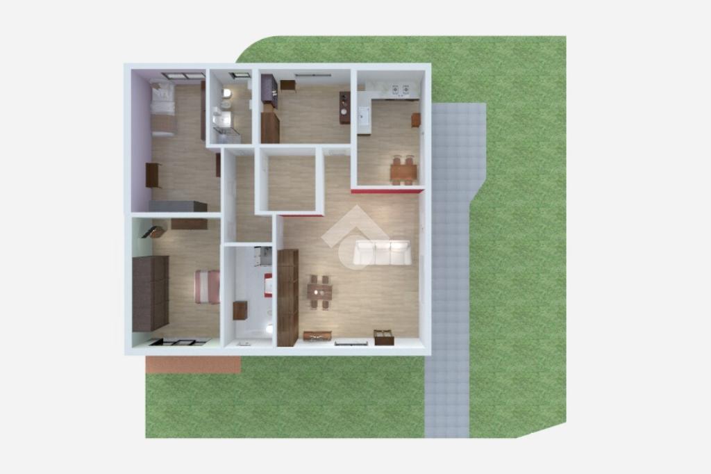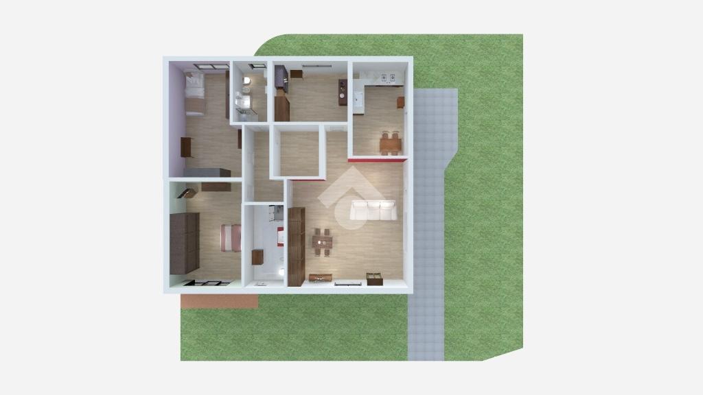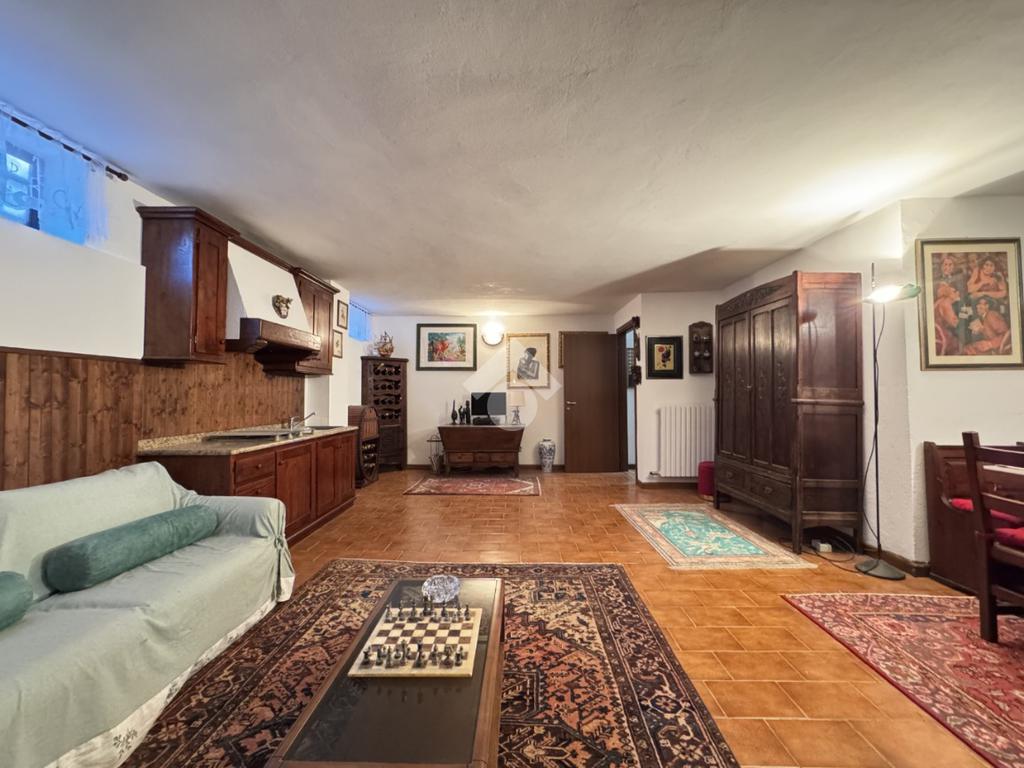 L’immobile, il cui accesso è possibile dal portico privato, si presenta con l’ampio soggiorno, luminoso grazie alla porta finestra. Dal comodo disimpegno, si accede alla cucina separata ed abitabile e alla prima camera/studio, la cui funzione può cambiare in base alle proprie esigenze.