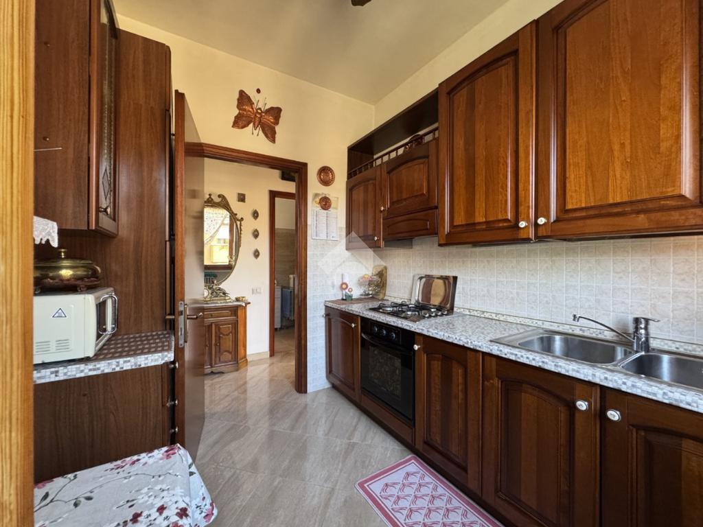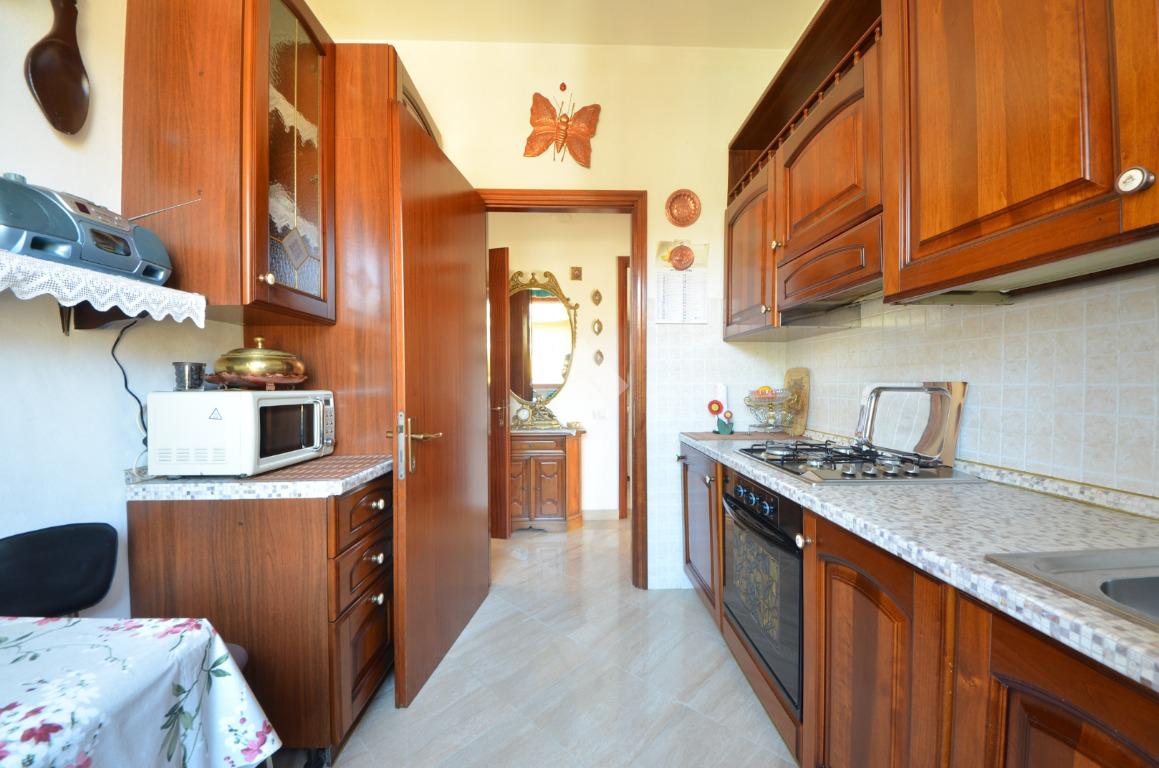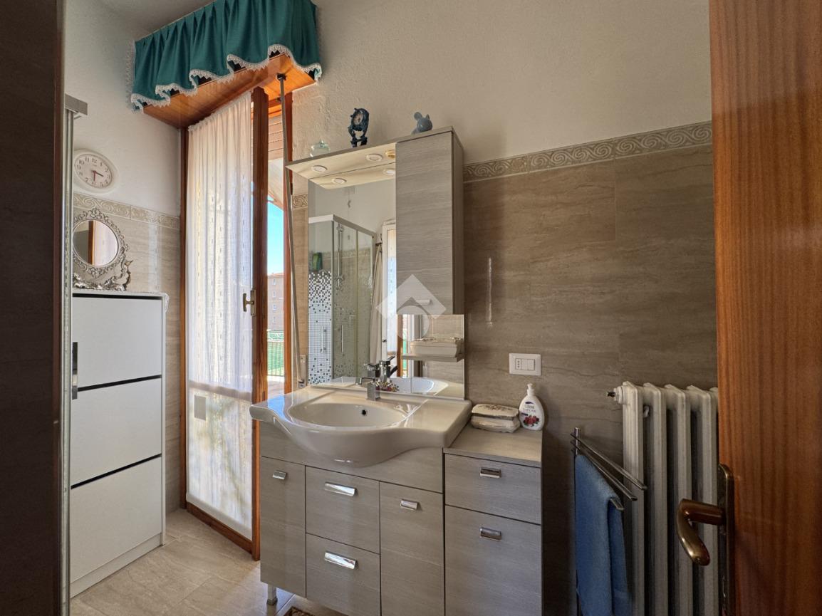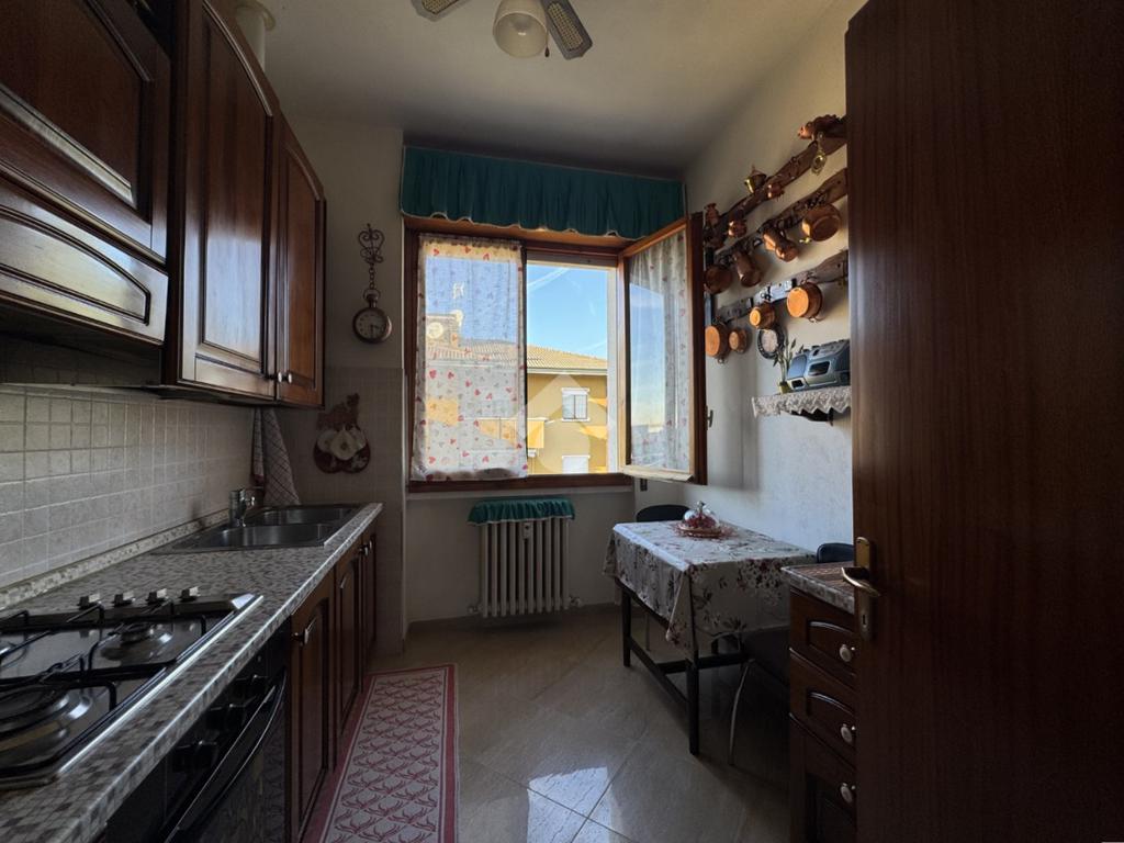 Un comodo disimpegno conduce alla cucina abitabile separata, al bagno finestrato dotato di box doccia e dalla spaziosa camera matrimoniale, con accesso diretto al terrazzo privato.