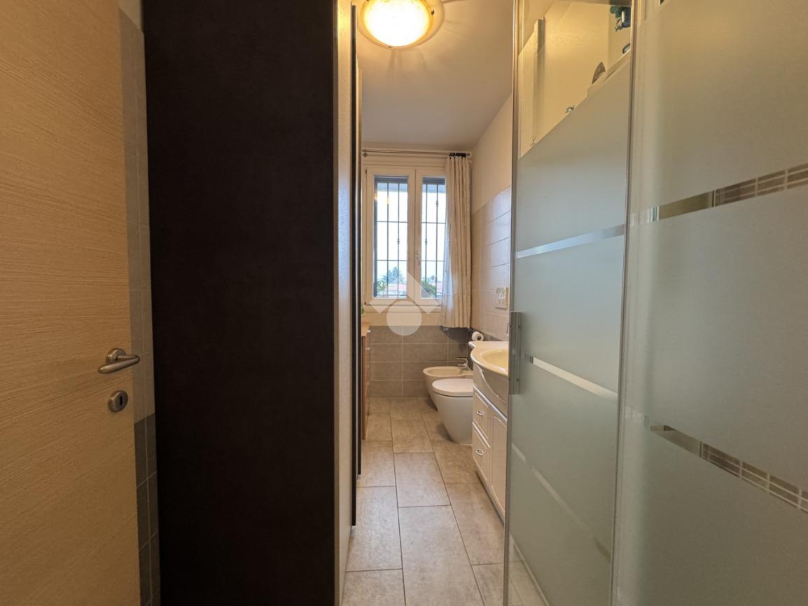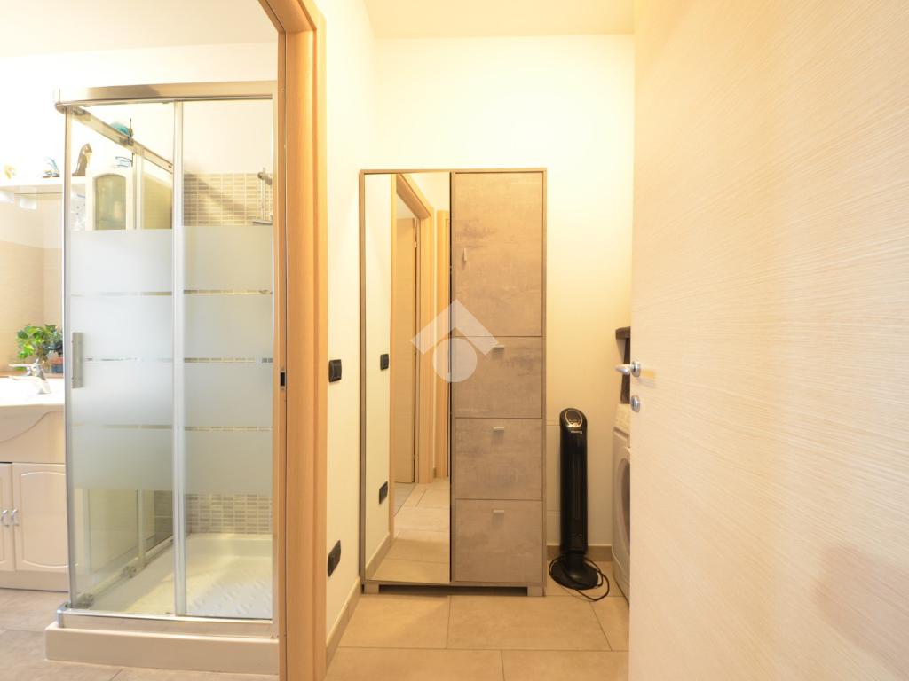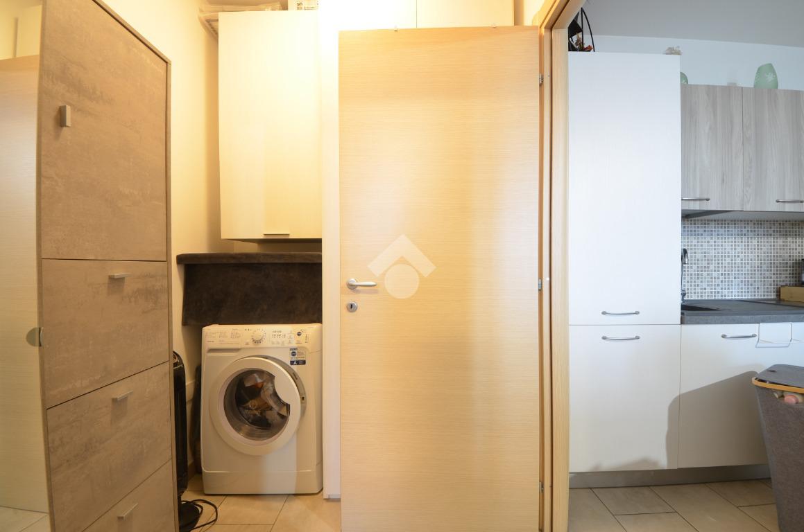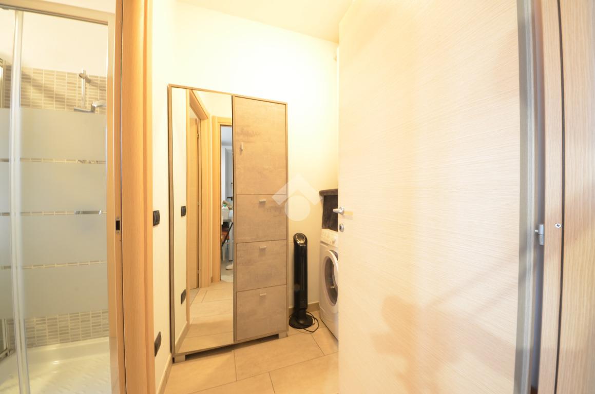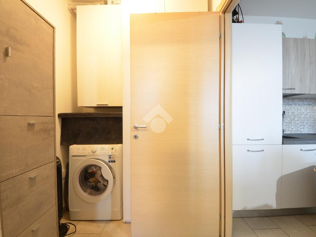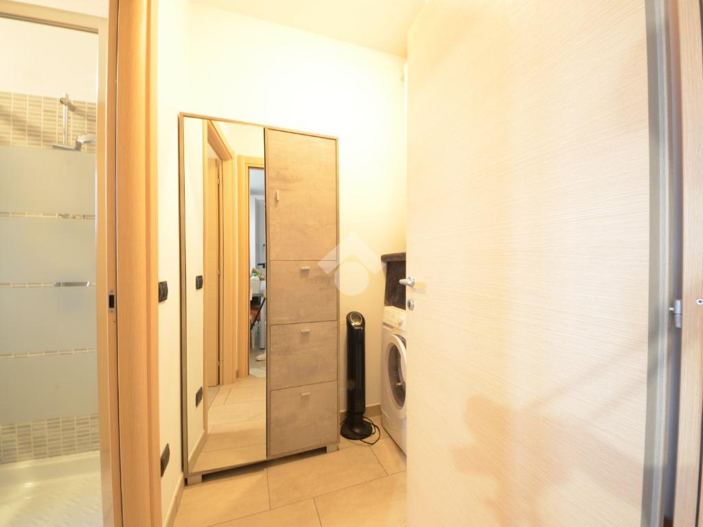 Un ampio disimpegno, adibito a lavanderia, separa l'ambiente open space dal bagno finestrato dotato di box doccia.