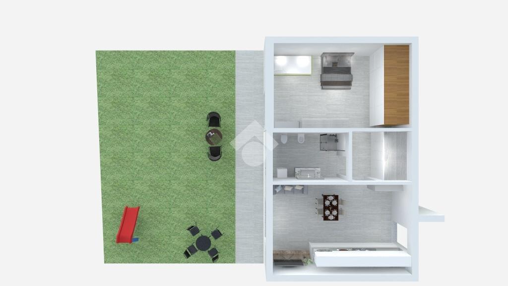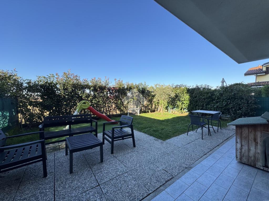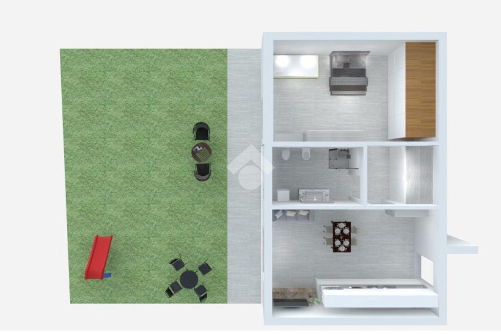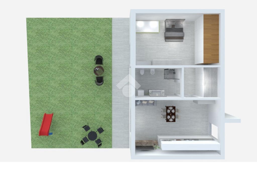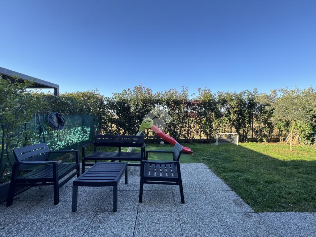 L’appartamento si apre sulla zona giorno, composta da un luminoso soggiorno con cucina a vista; tramite una porta finestra è possibile accedere al giardino privato.