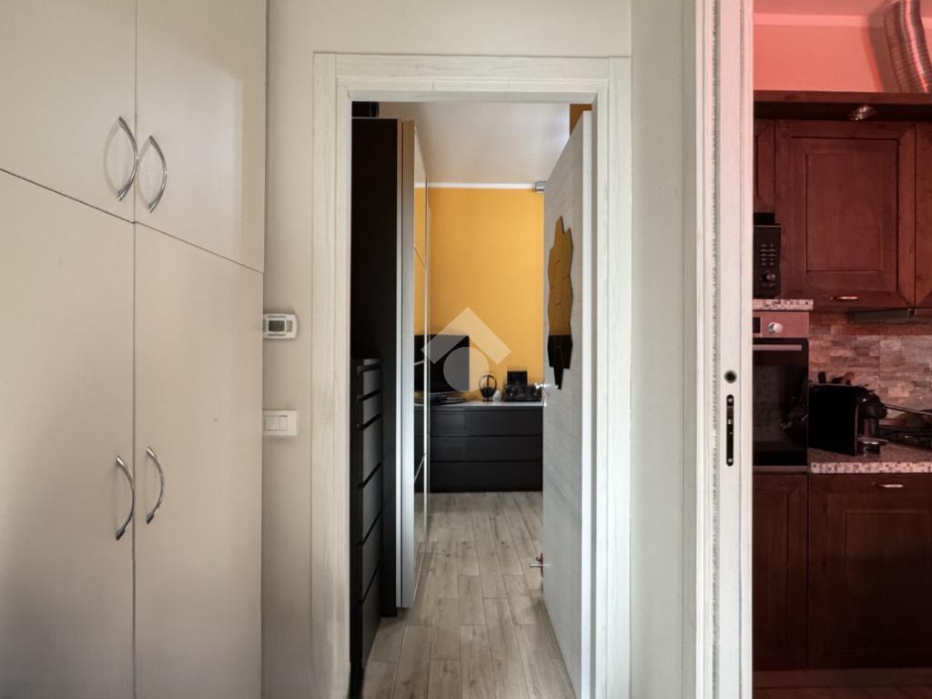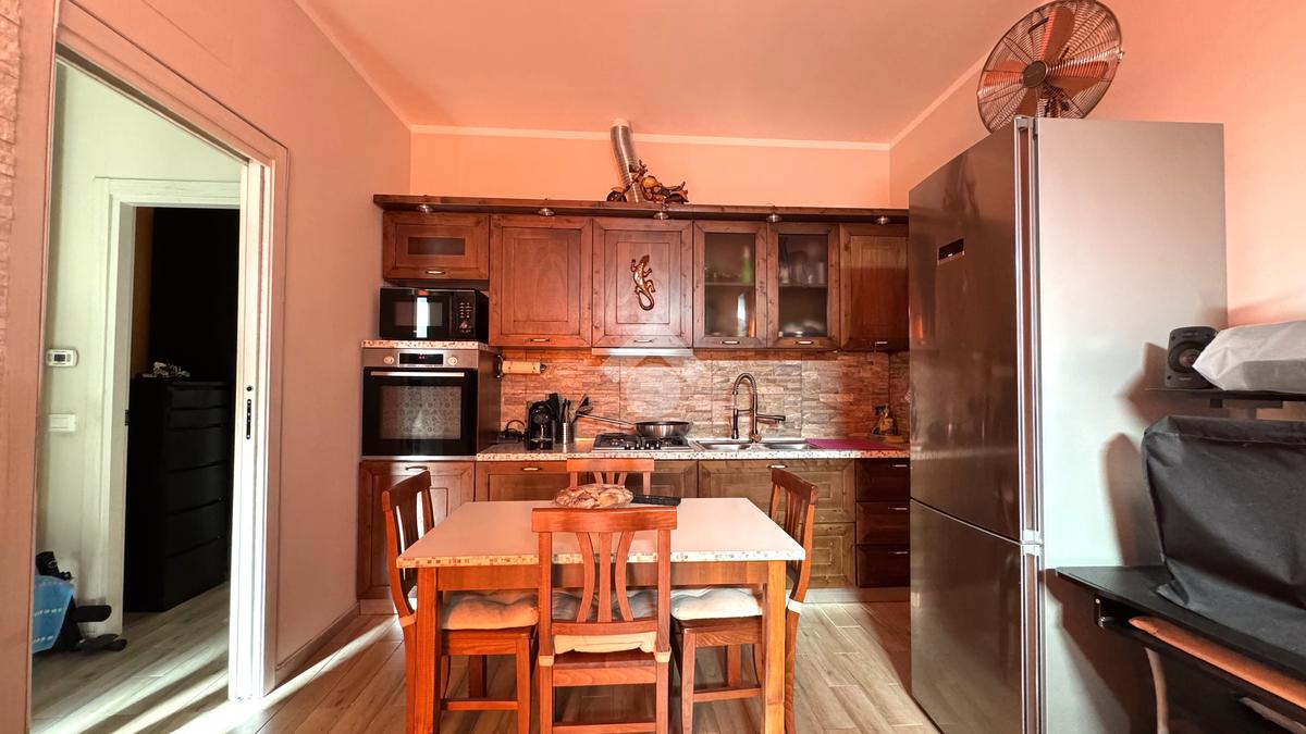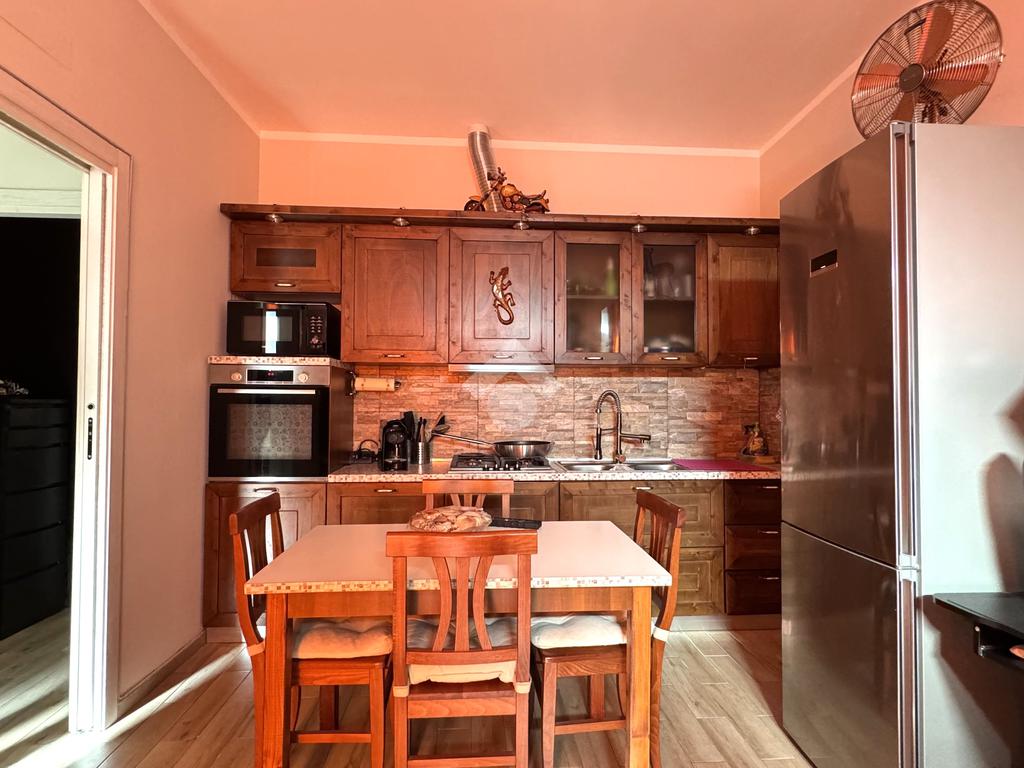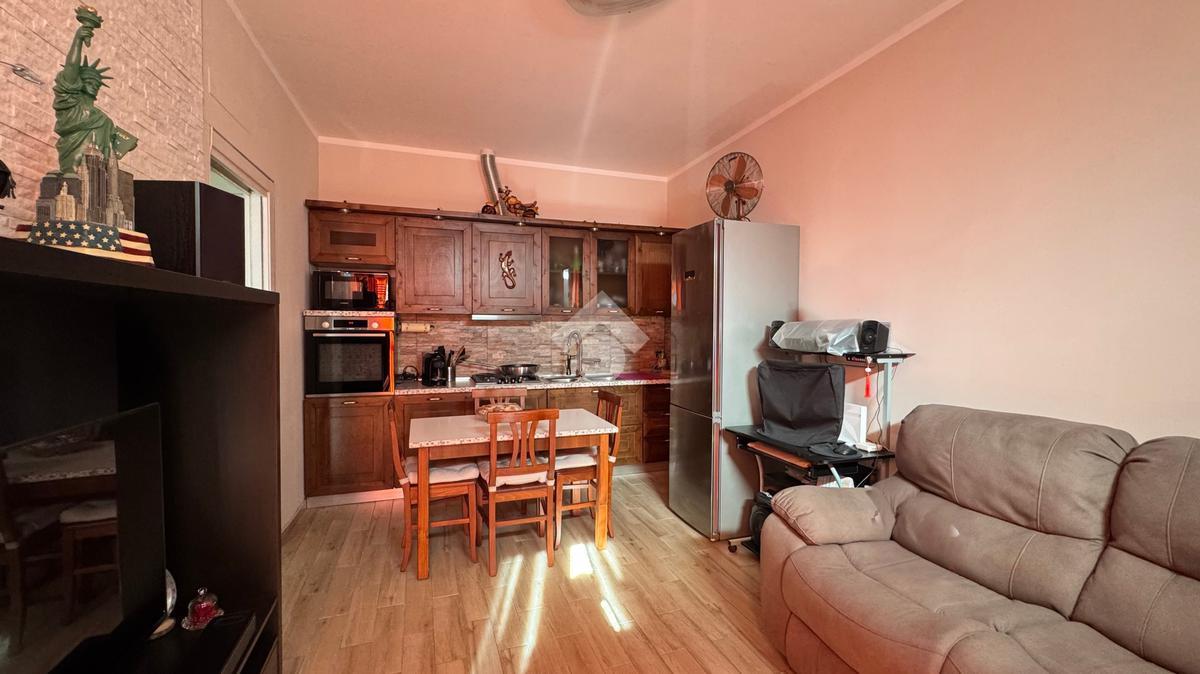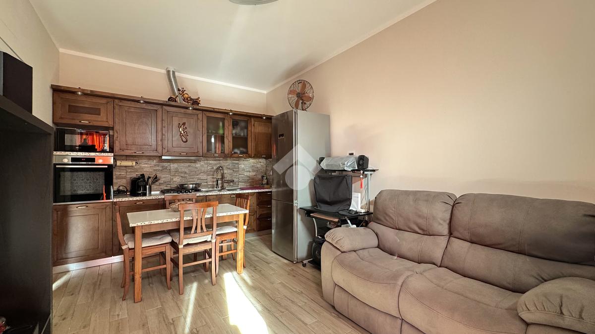 L'appartamento si apre sulla zona giorno, composta dal soggiorno con cucina a vista, luminoso grazie alla porta finestra.