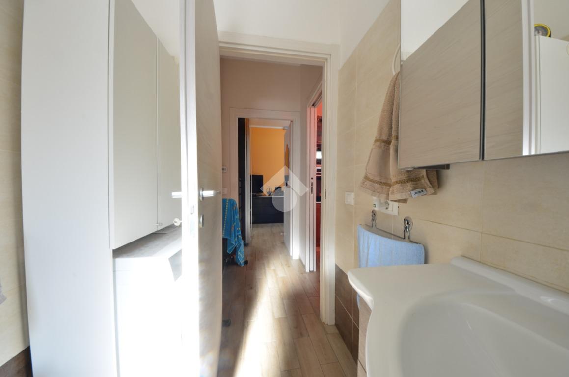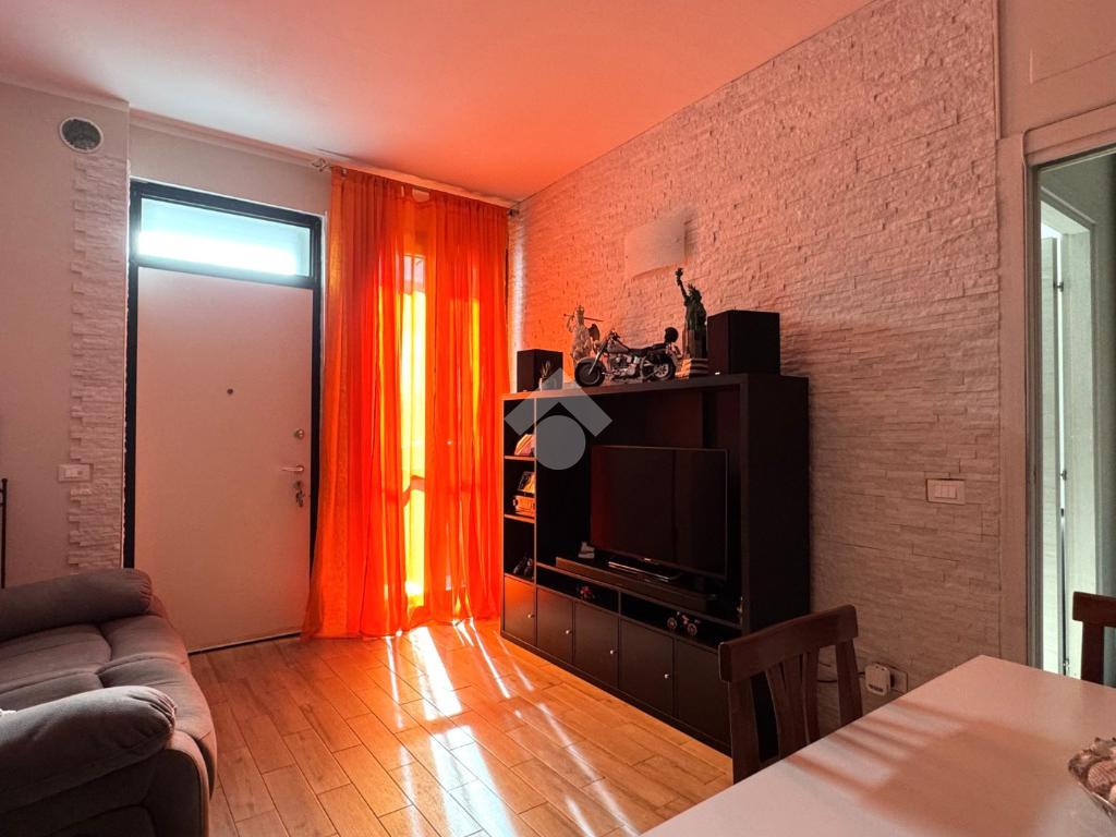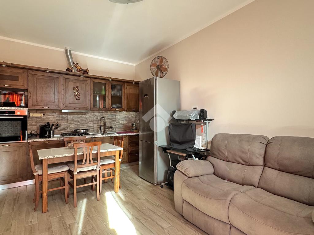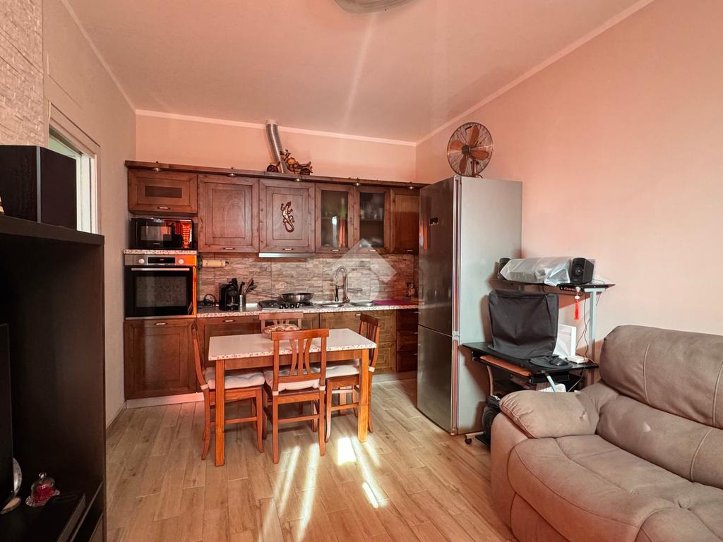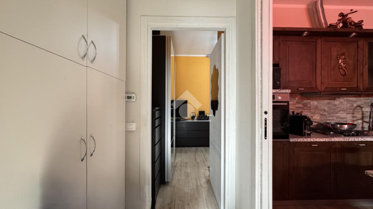 L'appartamento si apre sulla zona giorno, composta dal soggiorno con cucina a vista, luminoso grazie alla porta finestra.