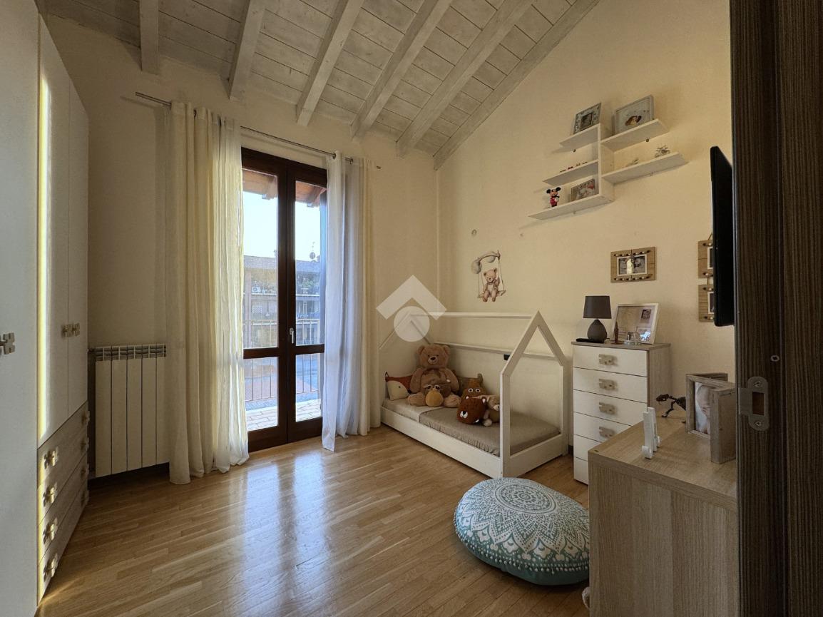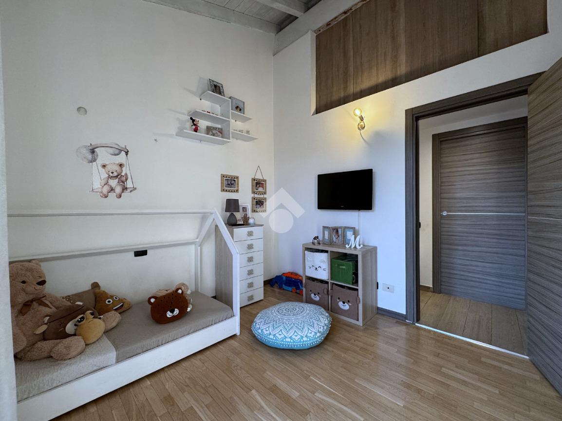 Un comodo corridoio, separa la zona giorno dalla zona notte, dove troviamo il bagno finestrato dotato di box doccia, la cameretta e la camera matrimoniale, anch'esse dotate di porta finestra, che permettono l'accesso al balcone privato continuo.